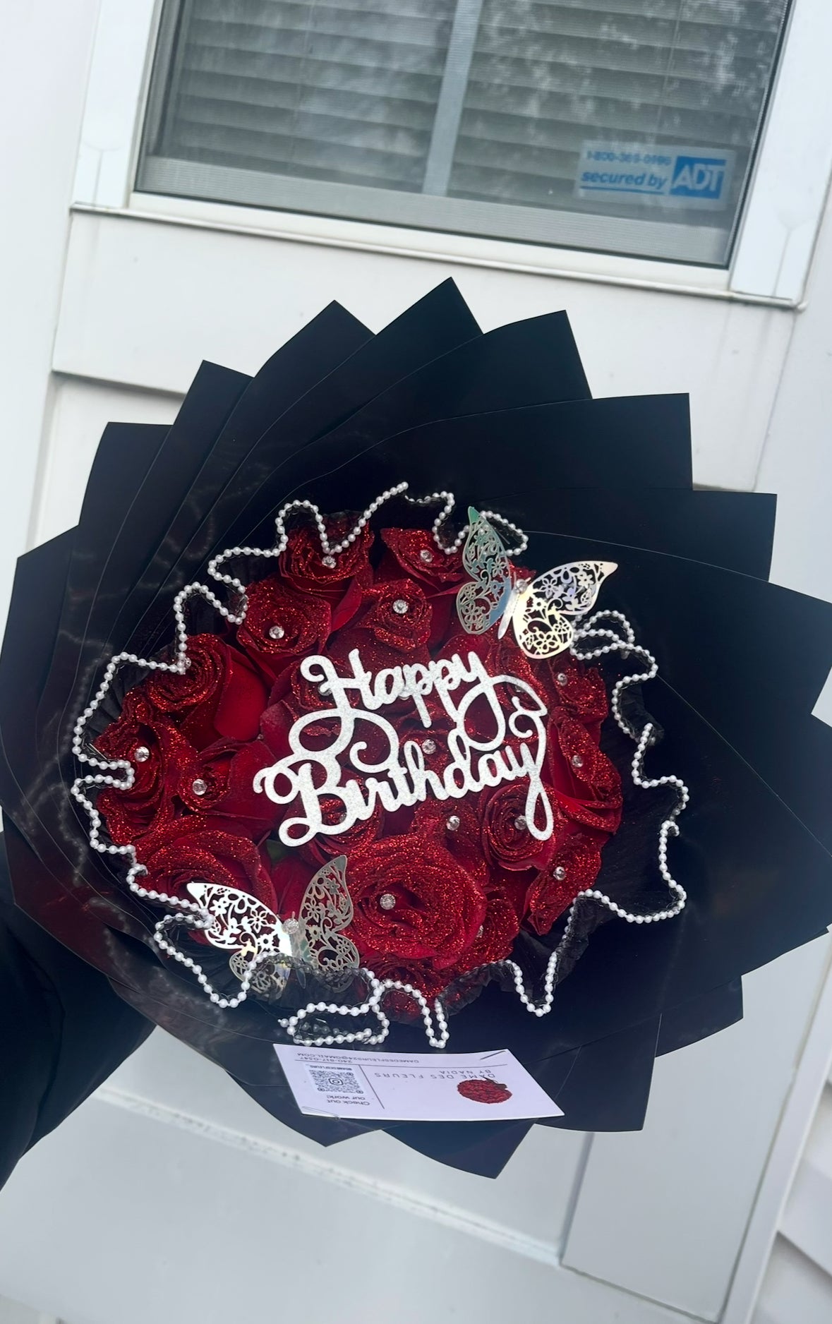 For the one who celebrates herself loudly and gracefully. Birthday Behavior is a bouquet that commands attention — red glitter roses wrapped in sleek black film, finished with pearls and butterflies, and a sticker.