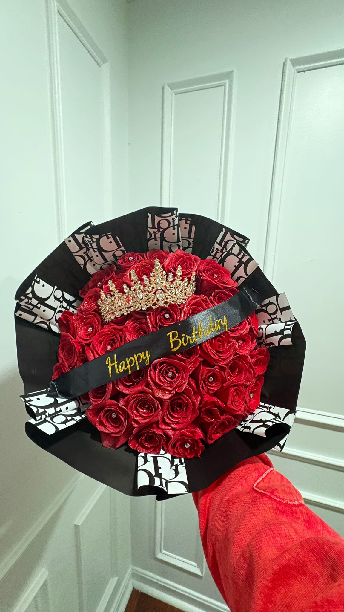 Reine Rouge—“The Red Queen”—is a masterpiece of passion and poise. Deep red roses crowned in shimmer capture the essence of divine royalty. Perfect for birthdays and milestones that celebrate power, beauty, and the woman walking in both love and authority.