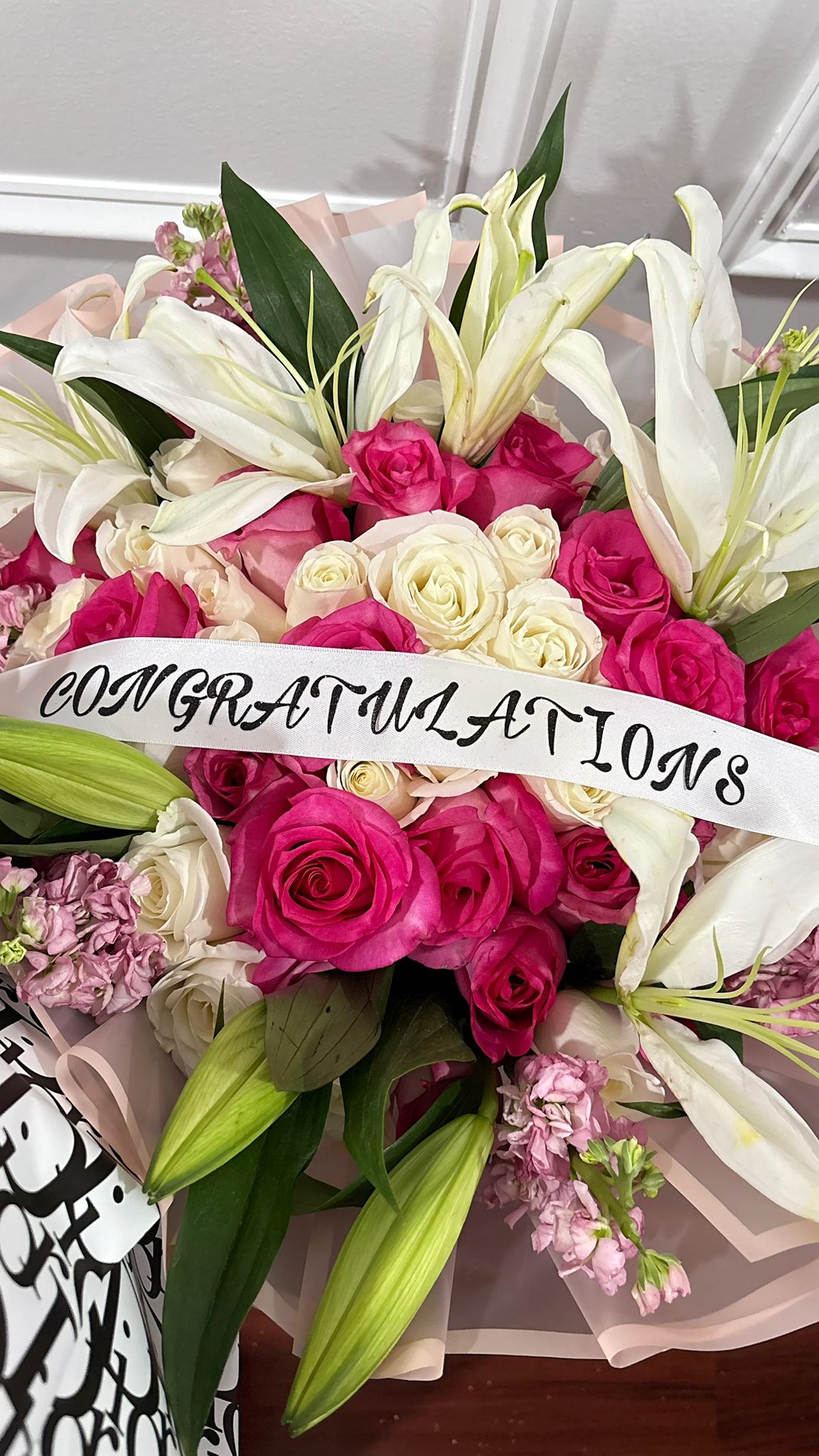 "Becoming" honors the beauty of belief and becoming. Blushing pink roses meet pure white lilies in a bouquet that whispers grace and rebirth. It’s a floral prayer for those stepping boldly into their next chapter, guided by light and anchored in faith.