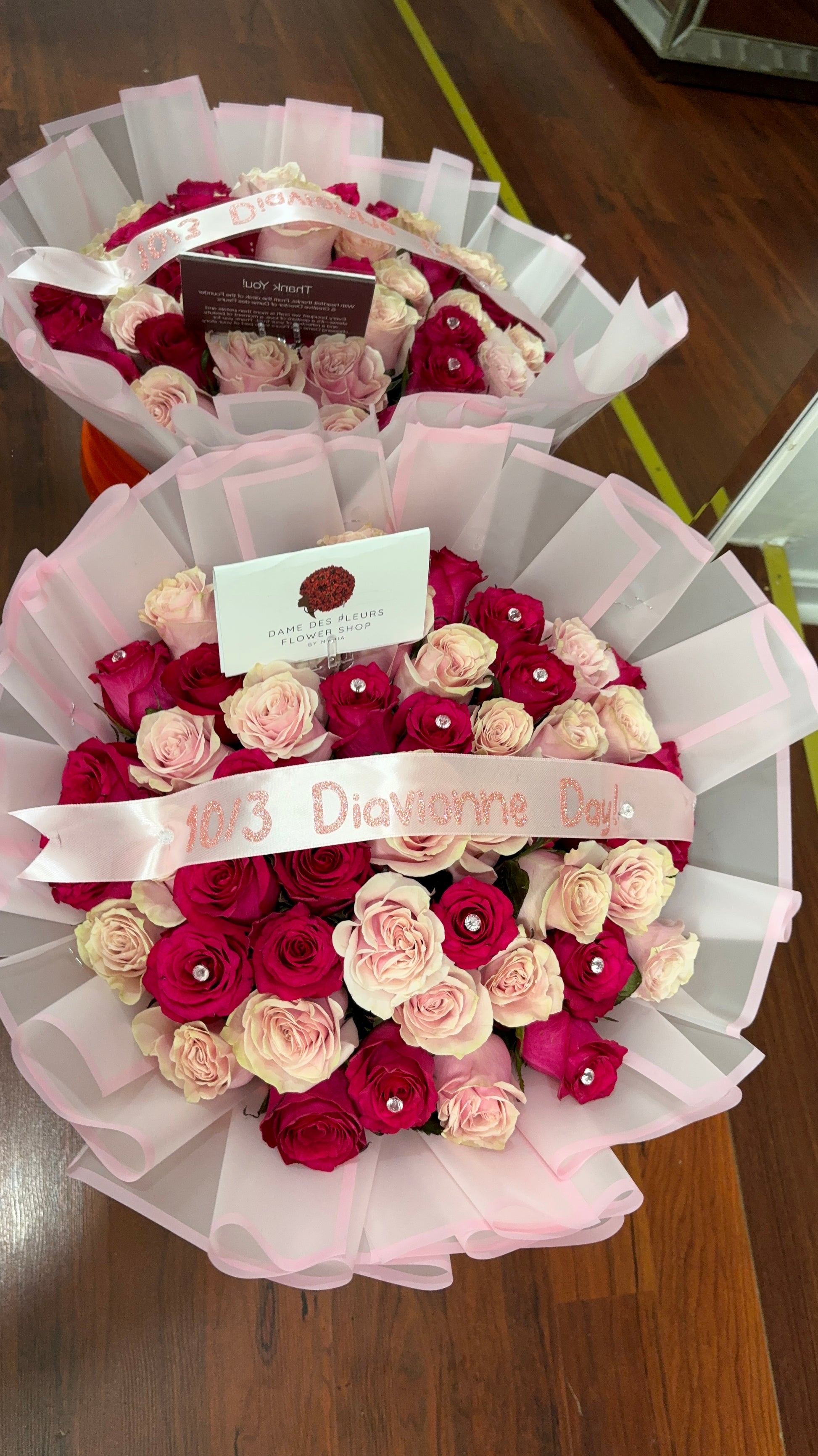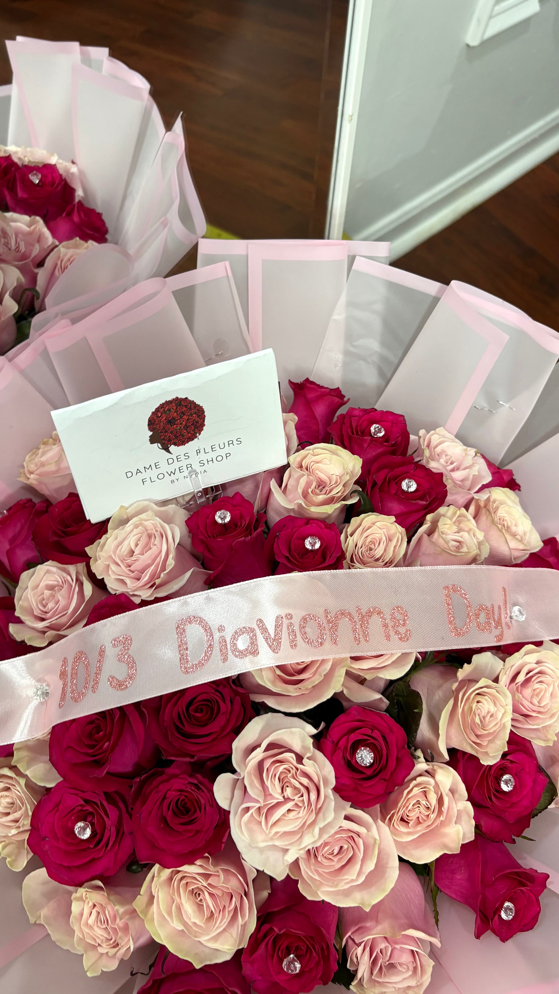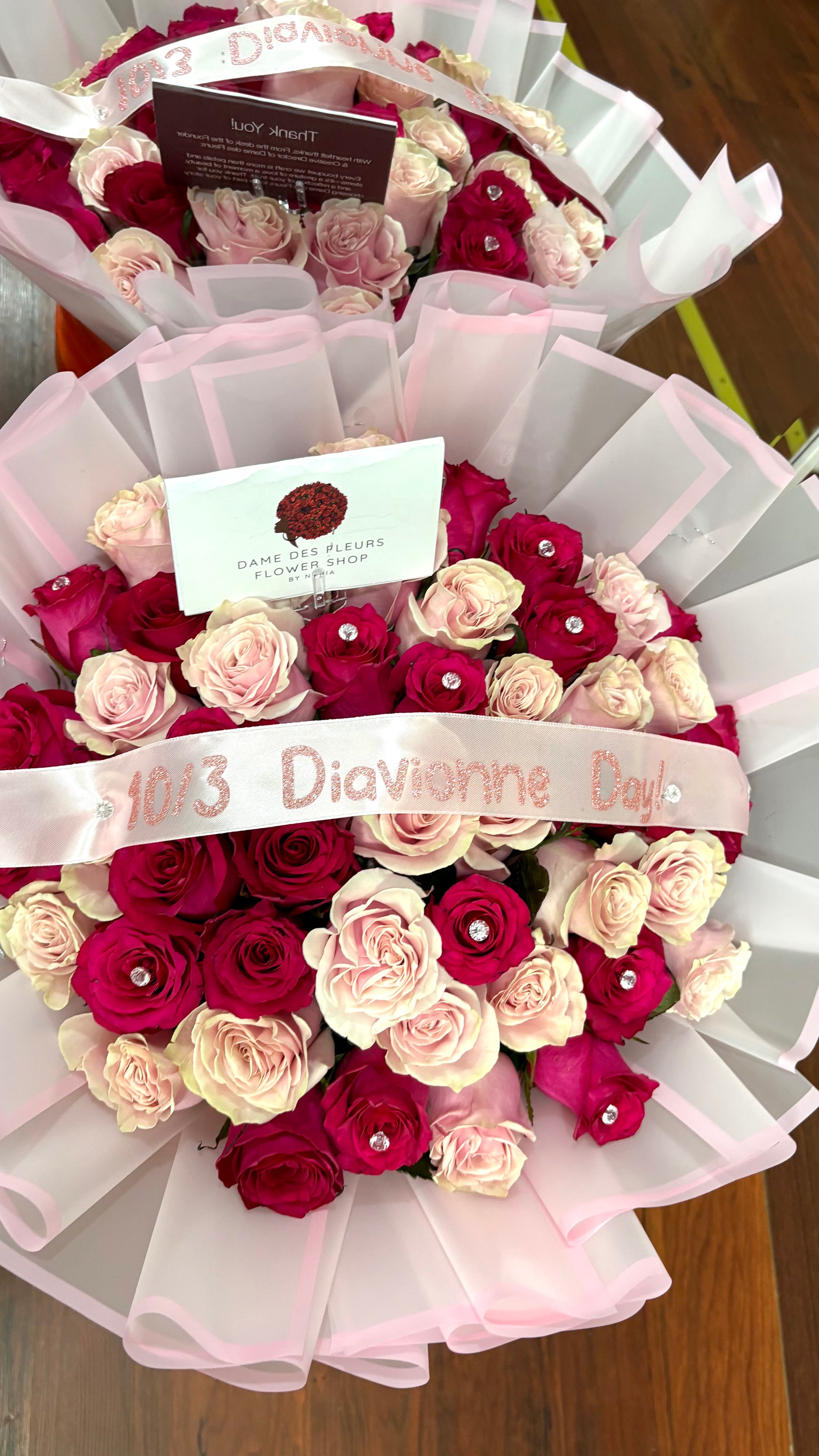ink and red roses wrapped in translucent blush layers, adorned with pearl pins and a glittered ribbon. It’s giving birthday softness, designer sweetness, and a moment made just for her.