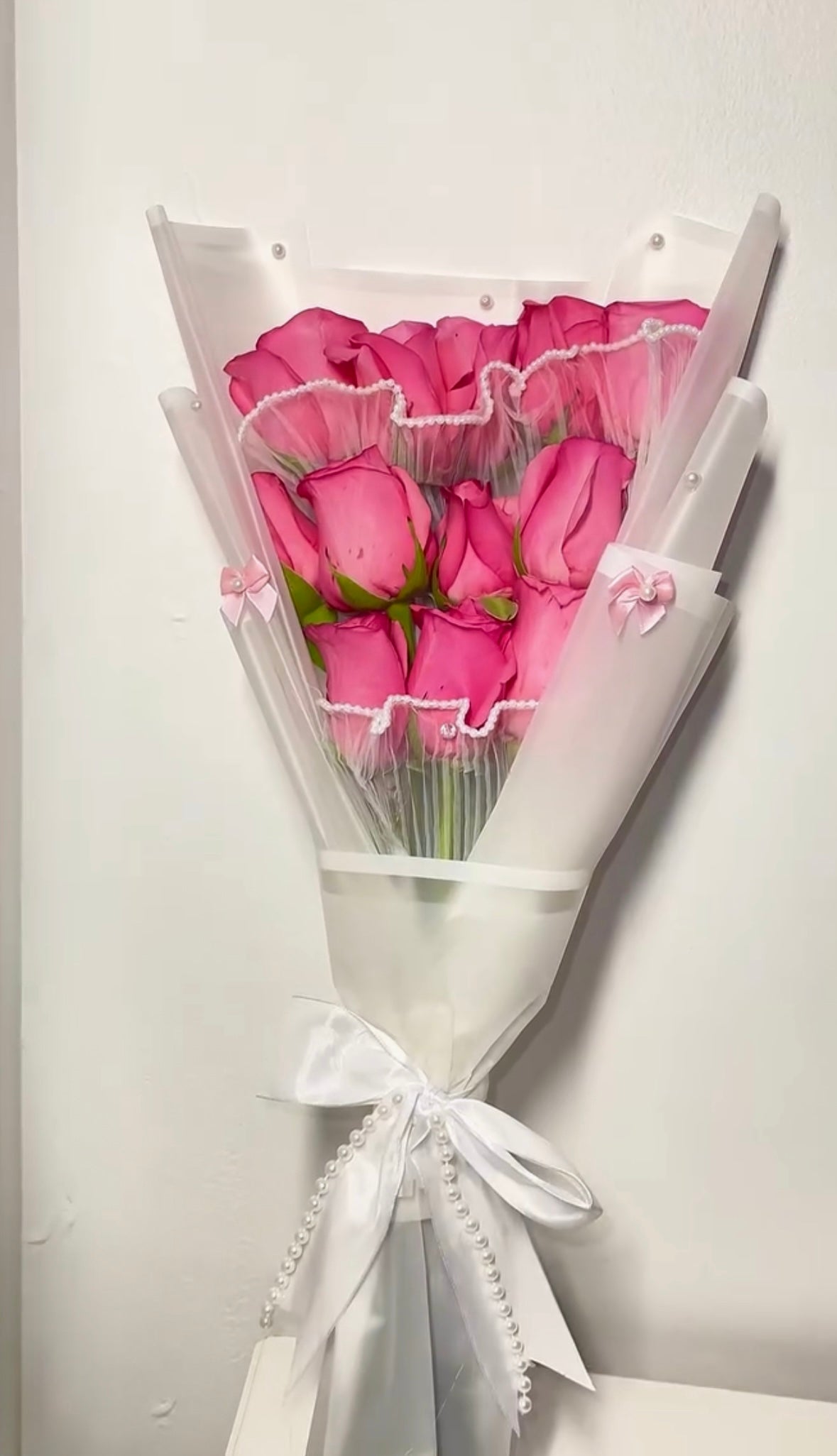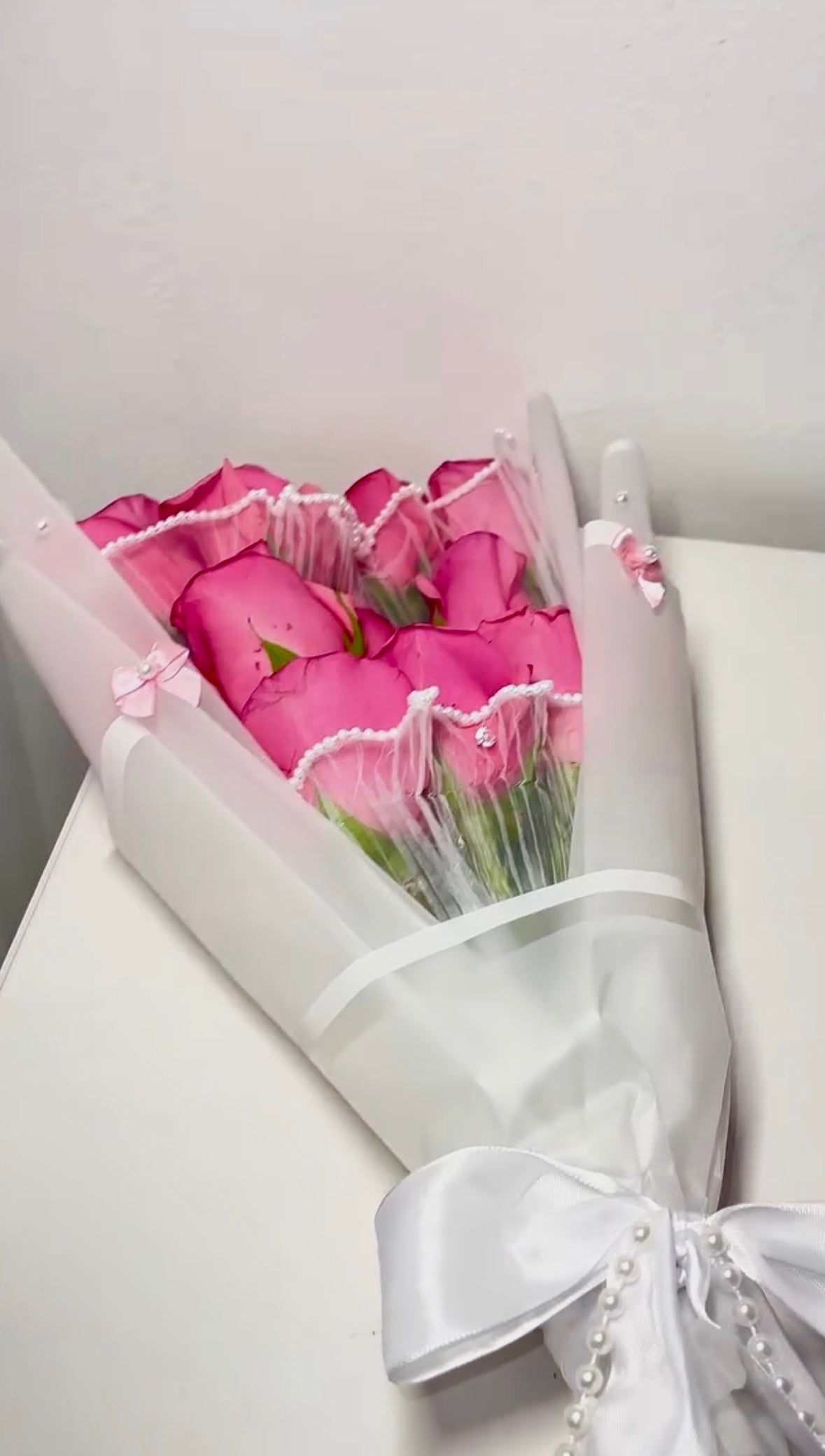 Delicate, feminine, and effortlessly timeless — Soft Girl features 12 soft pink roses wrapped in layered white paper and finished with a pearl rim for a touch of quiet luxury.