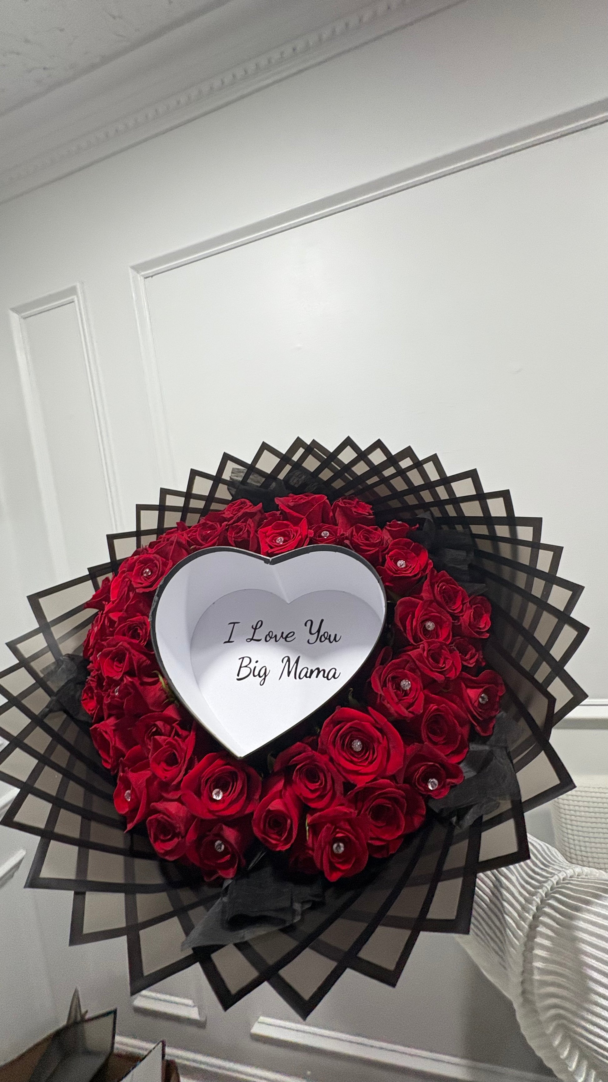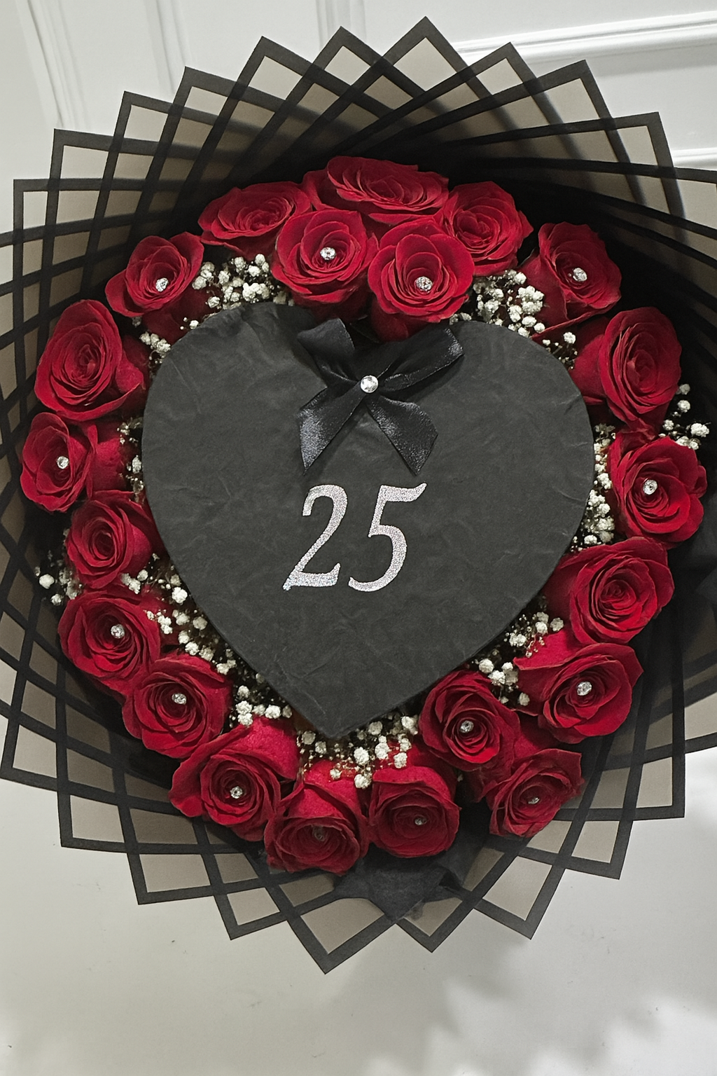 For the ones who love like fire. Burning Love features rich red roses framed in luxe black wrap, centered around a secret message hidden beneath a heart that’s revealed by flame. A bold, cinematic gesture for anniversaries, milestones, or the one who makes sparks fly.