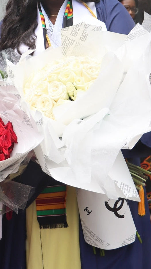Inspired by timeless couture, "Fatima" features 50 crisp white roses wrapped in Chanel-inspired paper and layered tissue, radiating peace, purity, and quiet confidence. Each bloom whispers luxury without saying a word, perfect for graduations, milestones, or women who embody poise and light.