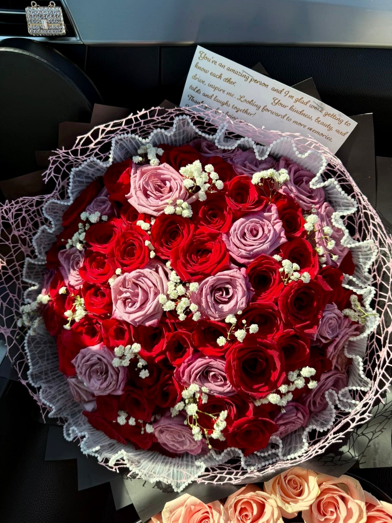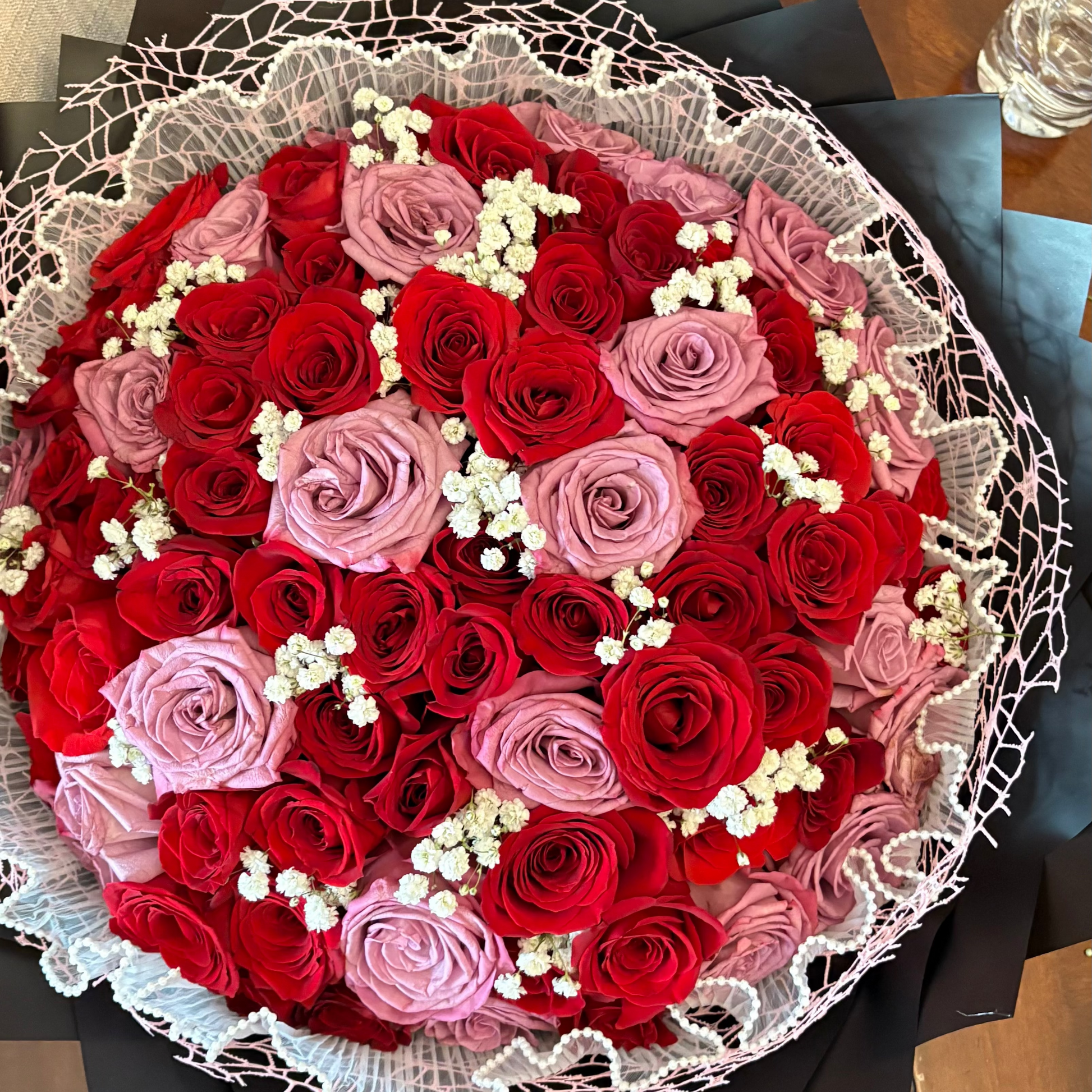 Soft Confession is designed for honest hearts and quiet romance. Red and lavender roses intertwine to tell a story of admiration and vulnerability — a bouquet that says, I don’t say this often, but I mean it.