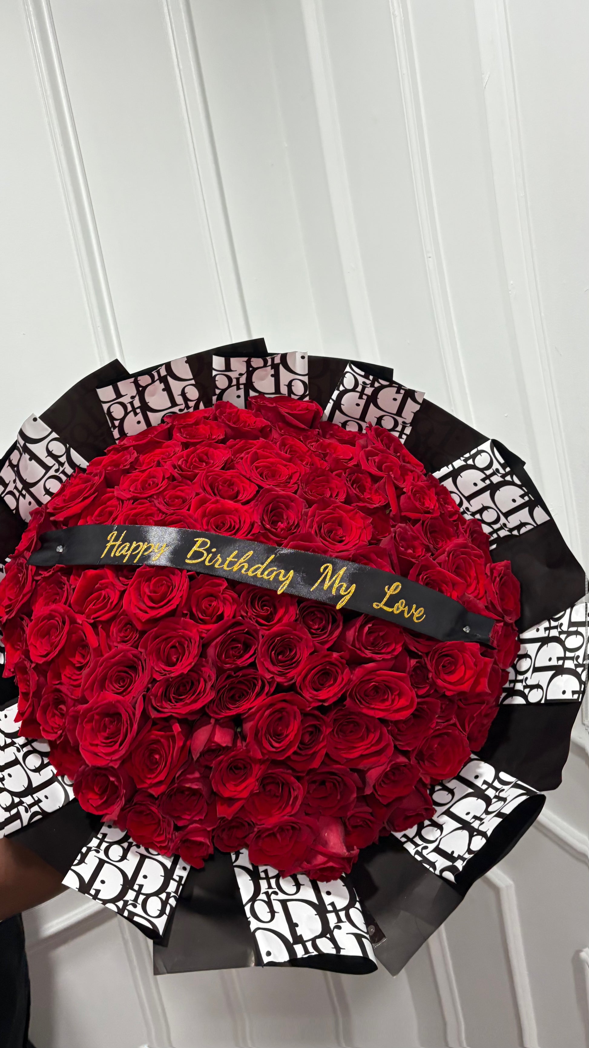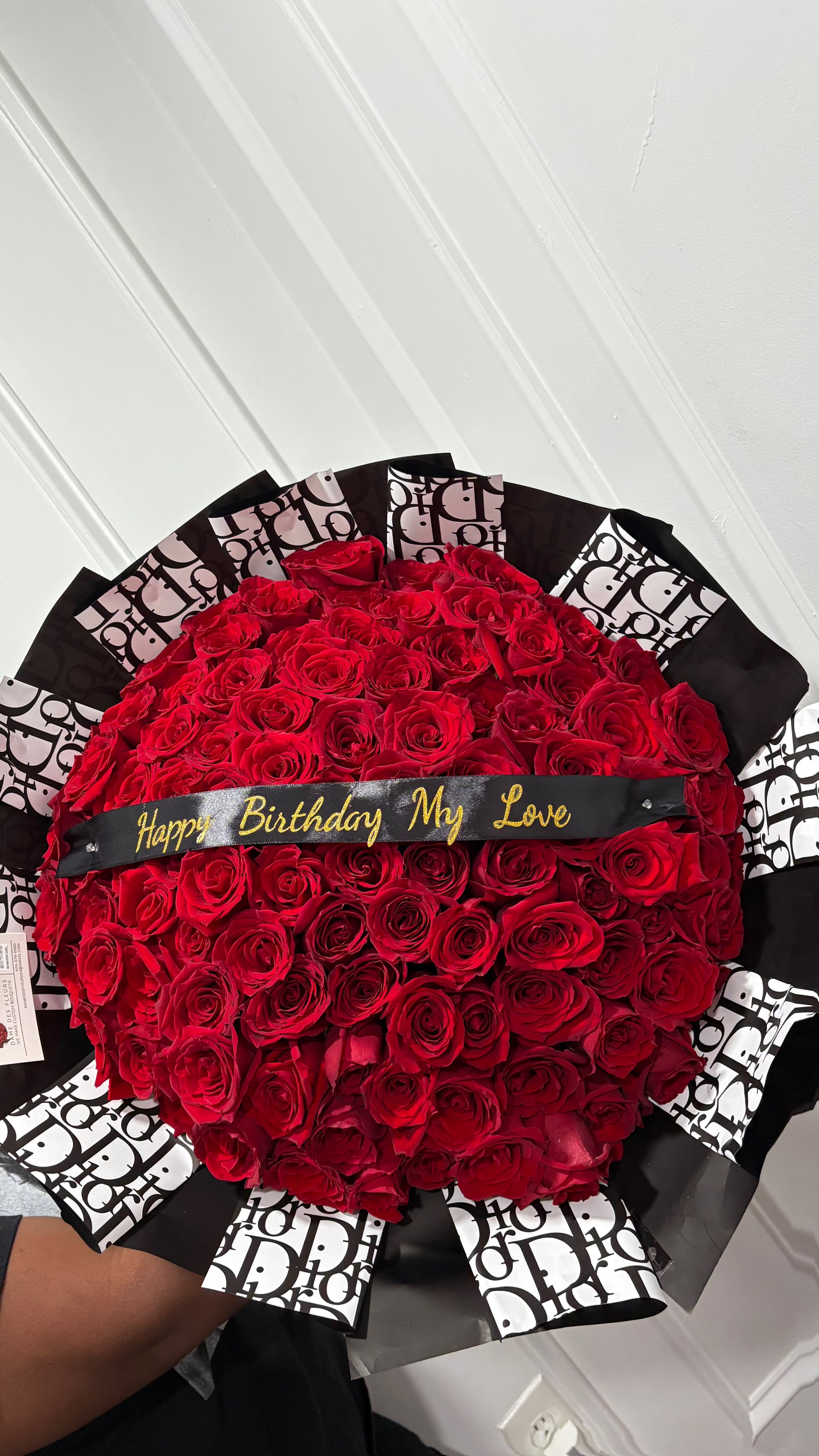 Where luxury meets passion. Midnight in Paris is a grand arrangement of 100 deep red roses wrapped in custom Dior paper — a bouquet designed to command attention and speak volumes without a word. Each rose symbolizes timeless love, elegance, and the kind of devotion that never fades.