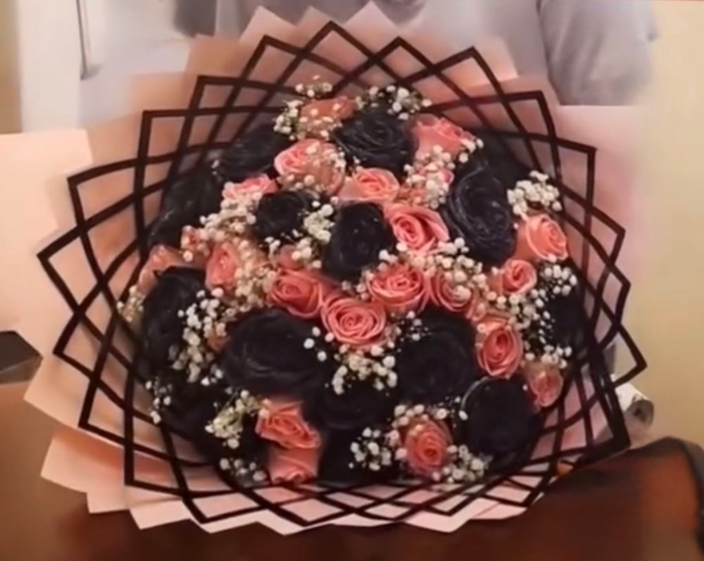 Navy and blush roses framed in geometric black lattice, softened with peach wrap and baby’s breath. It’s giving artful romance, quiet luxury, and muse energy — for the one who inspires everything.