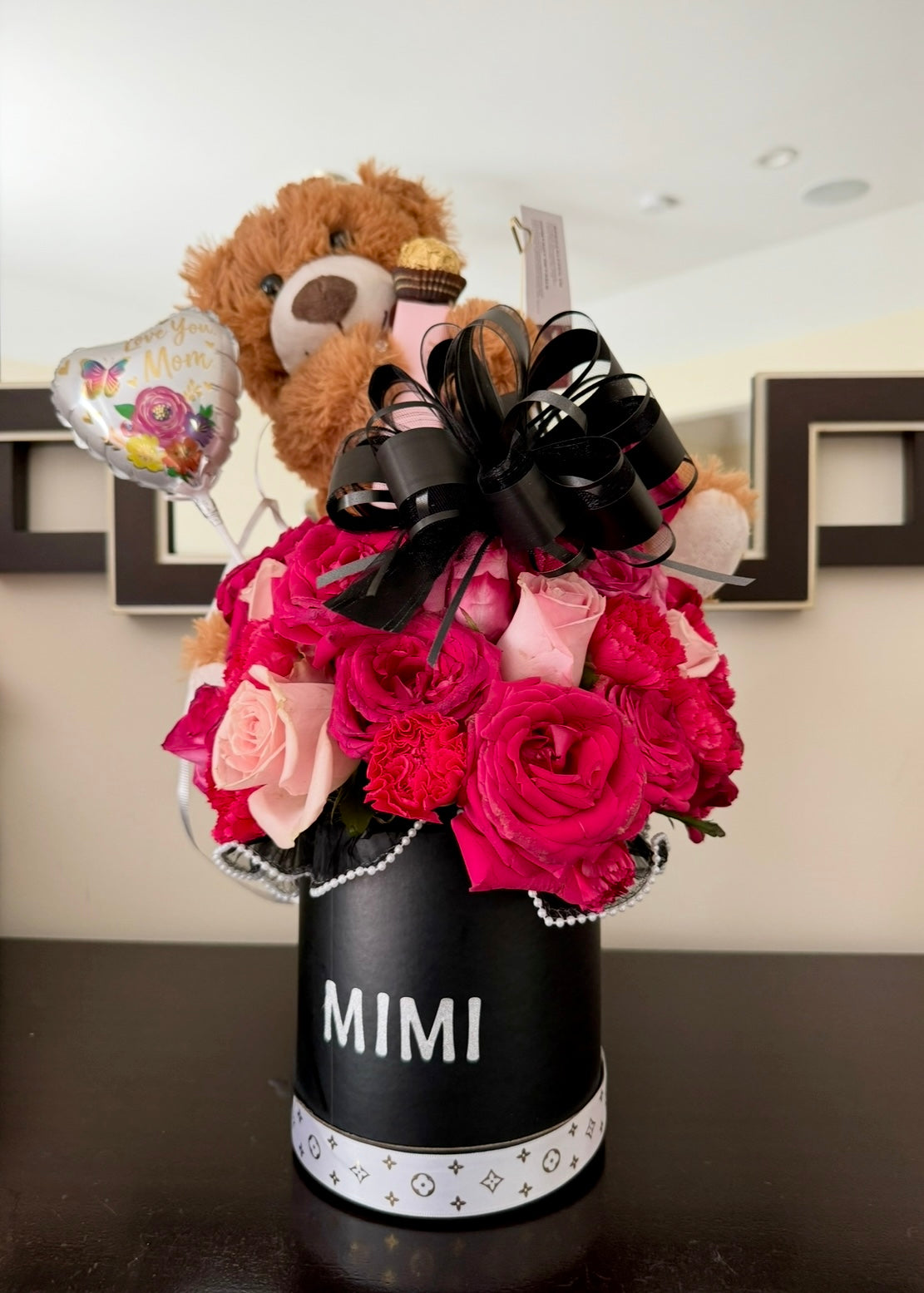A black hatbox overflowing with pink and red roses, pearls, and a plush teddy bear holding a heart balloon. It’s giving softness, gratitude, and designer love — for the mom who deserves more than flowers, she deserves a whole mood.