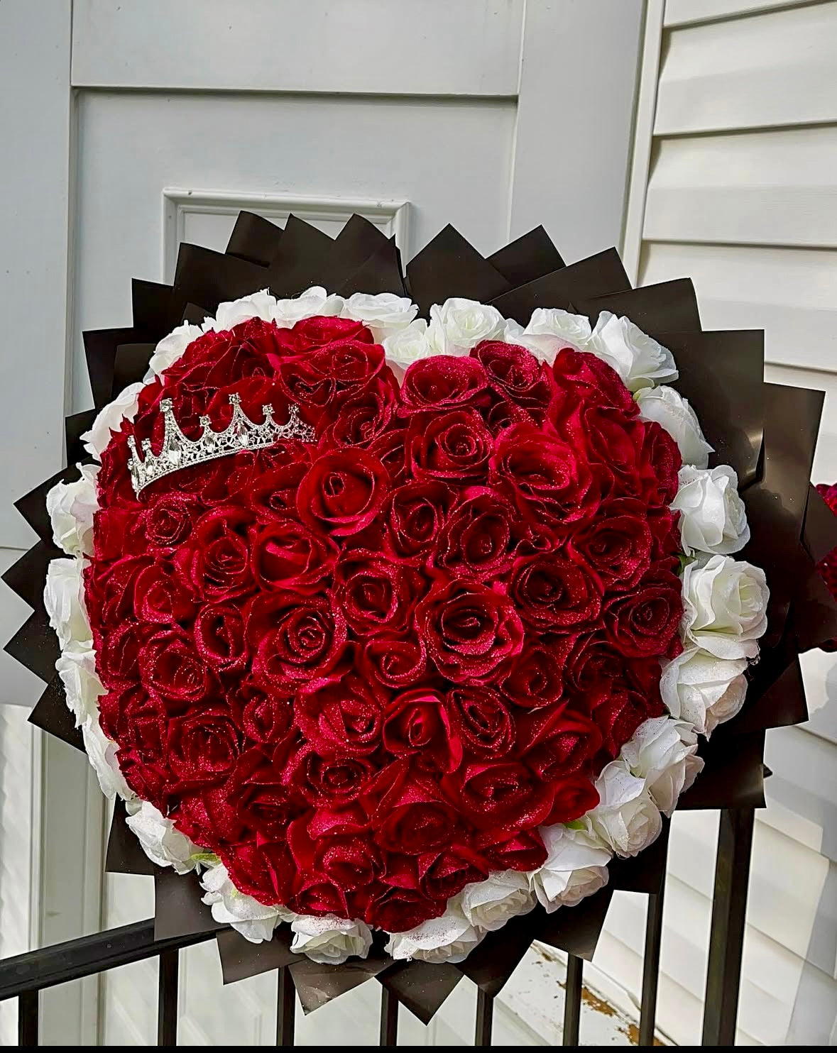 A divine statement of grace and power. Crowned in Favor features 100 roses with glitter, arranged in an opulent heart shape, surrounded by white blooms and topped with a crystal crown. Each rose symbolizes love covered in grace — a reflection of the woman who is favored, chosen, and radiant from within.