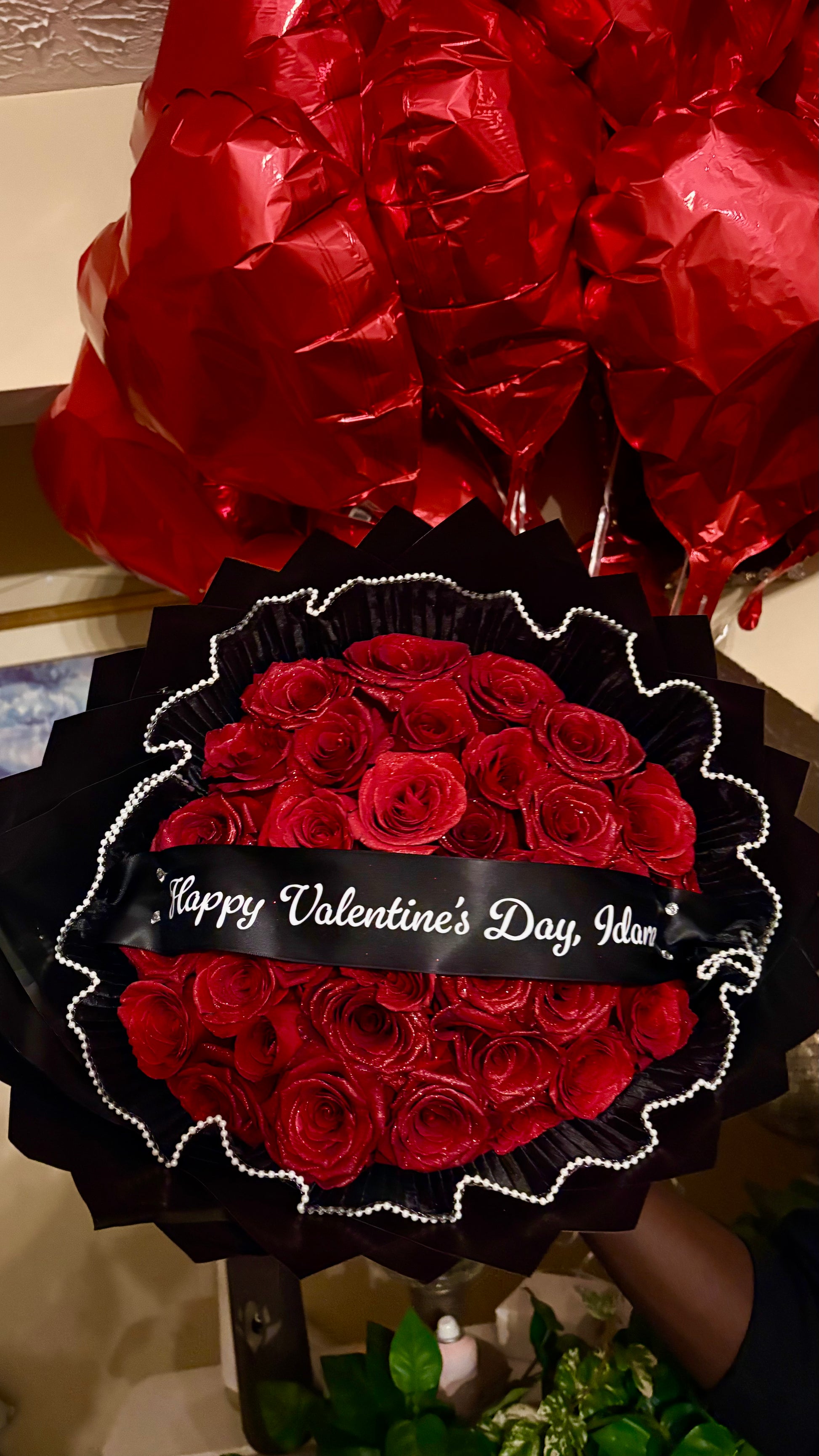 A bouquet that defines luxury romance. Red Velvet features 50 red glitter roses wrapped in sleek black film with pearl trim — elegant, bold, and irresistibly rich. It’s the kind of bouquet that says “I didn’t just think of you, I planned this.”