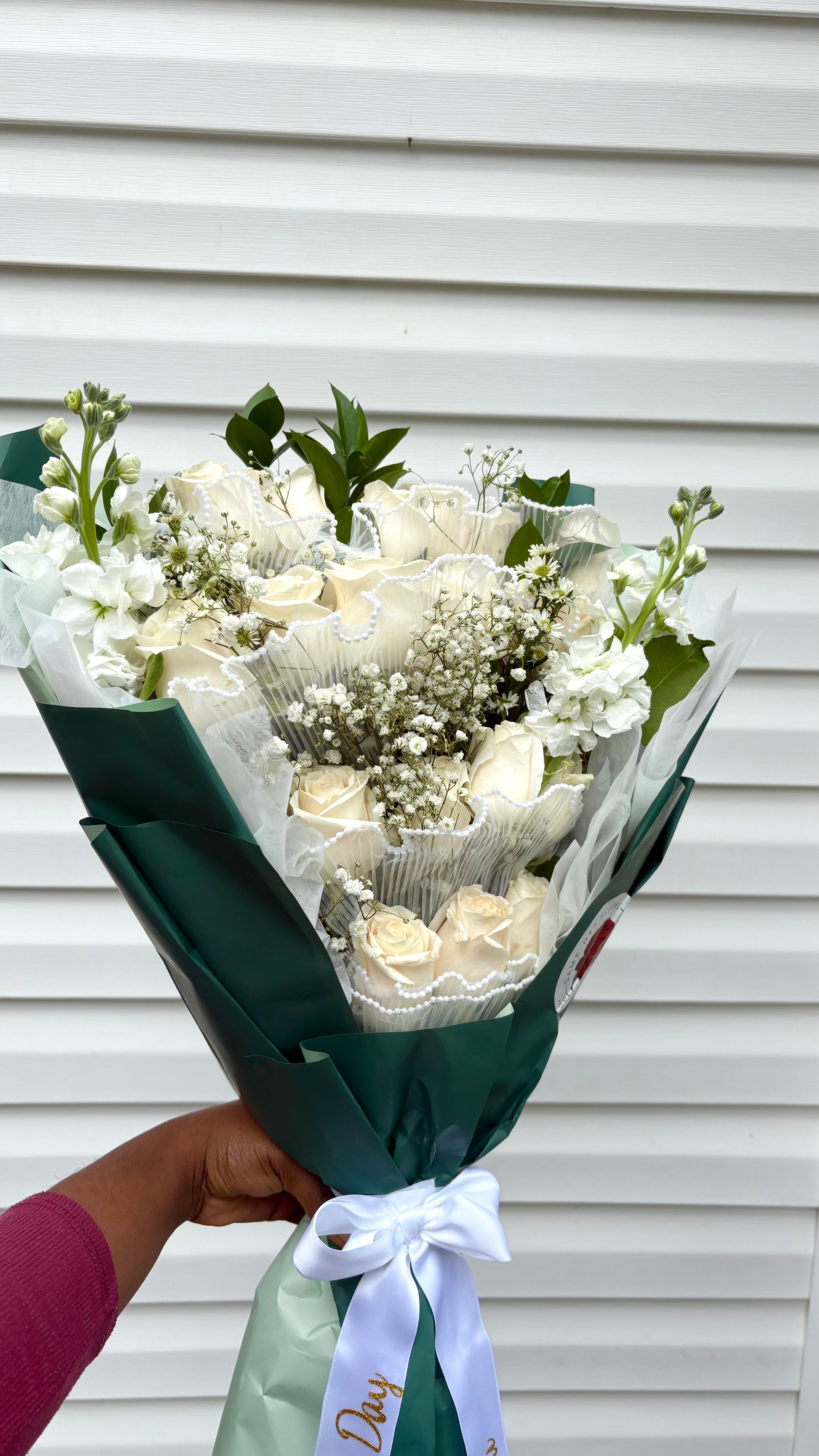 An ode to softness. Heaven Sent is a dreamy arrangement of white roses surrounded by airy baby’s breath and sheer pearl trim — a bouquet that speaks peace, grace, and quiet luxury. Wrapped in deep green and white, it’s perfect for birthdays, graduations, or moments that deserve calm beauty.