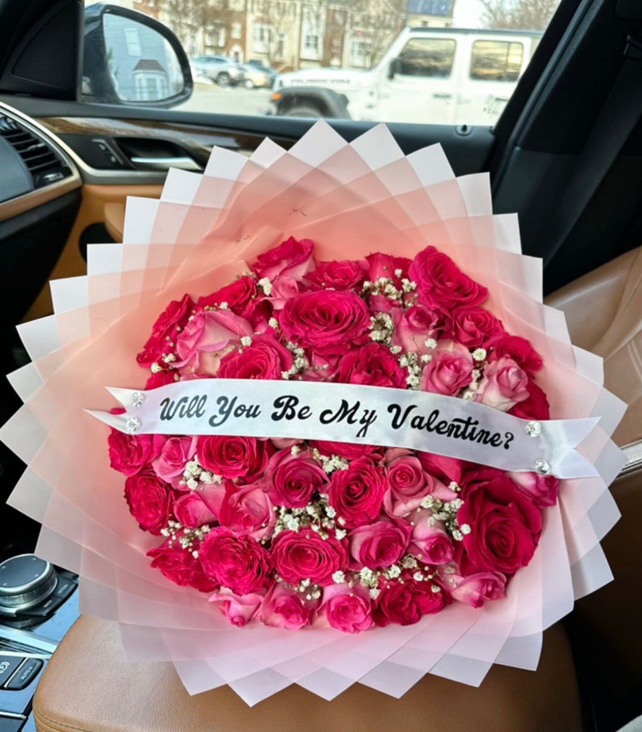 When words fall short, Say Yes speaks for you. A lush arrangement of pink roses wrapped in soft blush tones and finished with a custom banner — made for the moment you put your heart on the table.