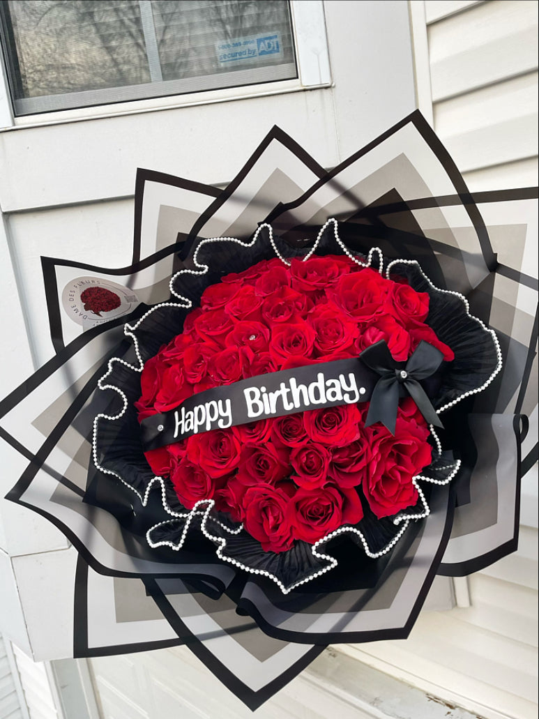 50 red roses wrapped in layered black and white star-cut paper, trimmed with pearls and a custom birthday banner. No need for bows — she is the present. This bouquet says “celebrated,” “chosen,” and “unforgettable.”
