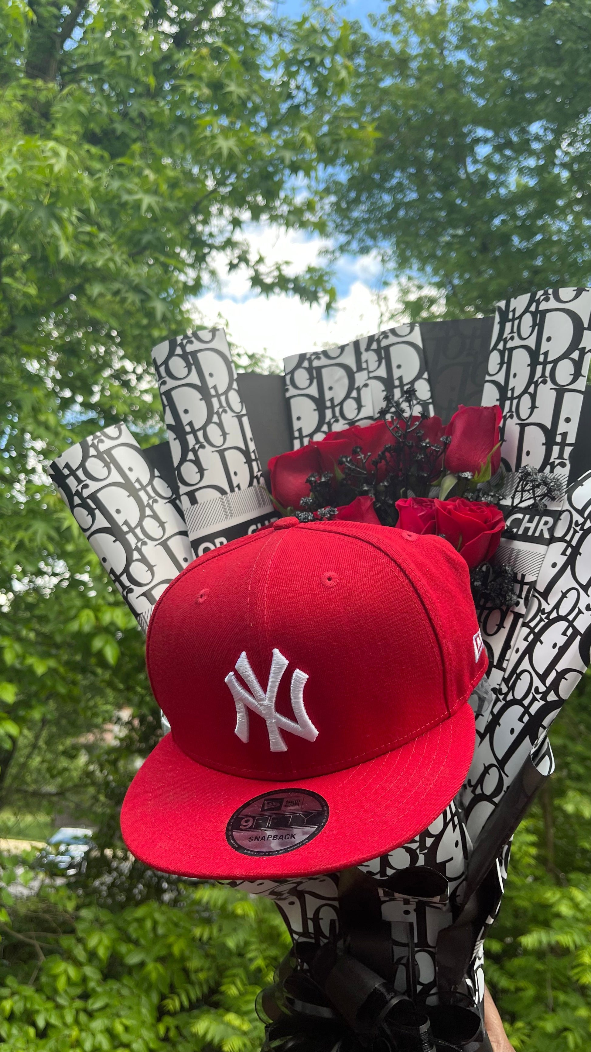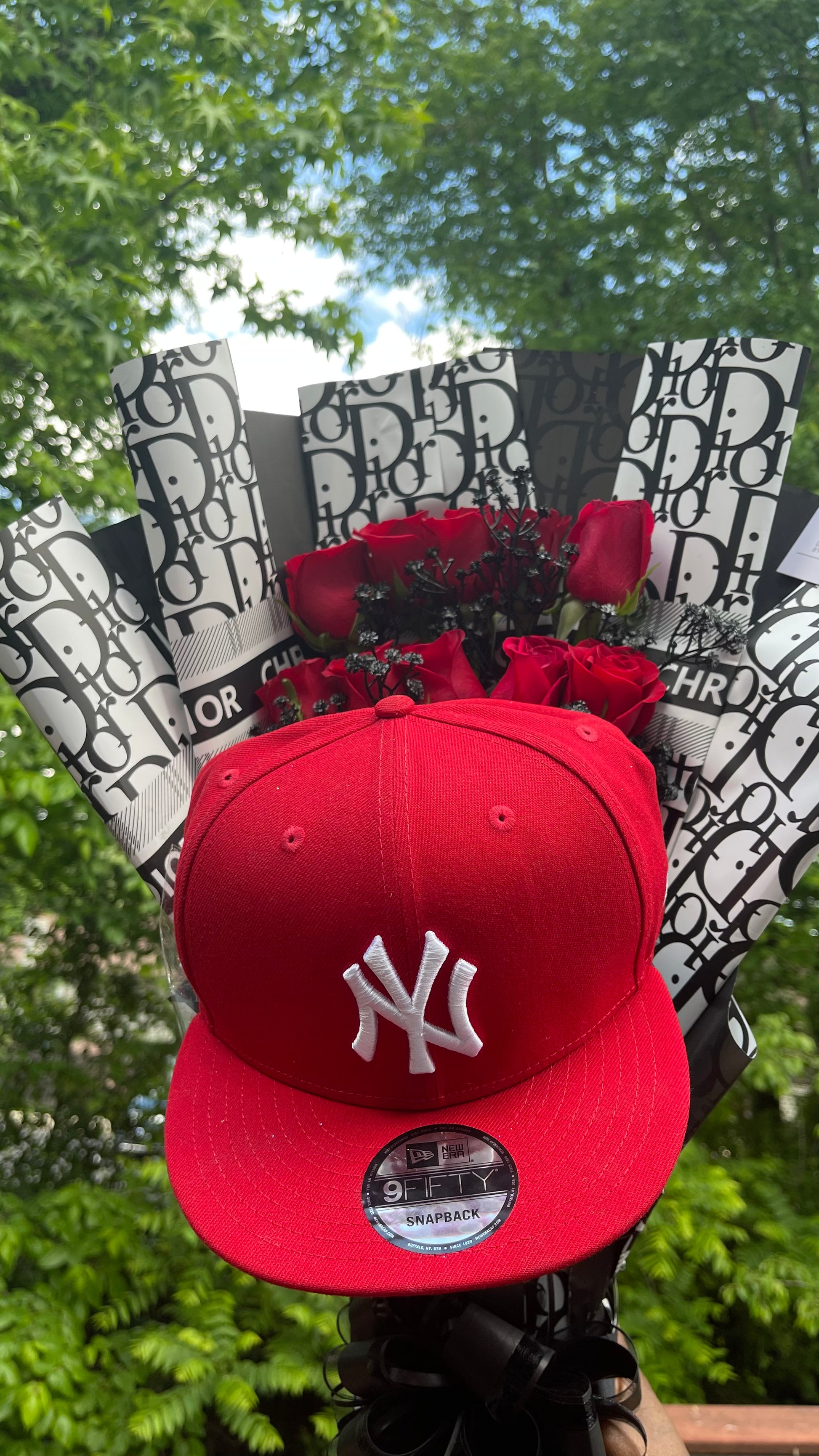 He Is Him is luxury meets street style. This arrangement blends 12–15 red roses with hand-sprayed black baby’s breath for a dramatic contrast — topped with a signature red snapback for a bold, personalized touch.