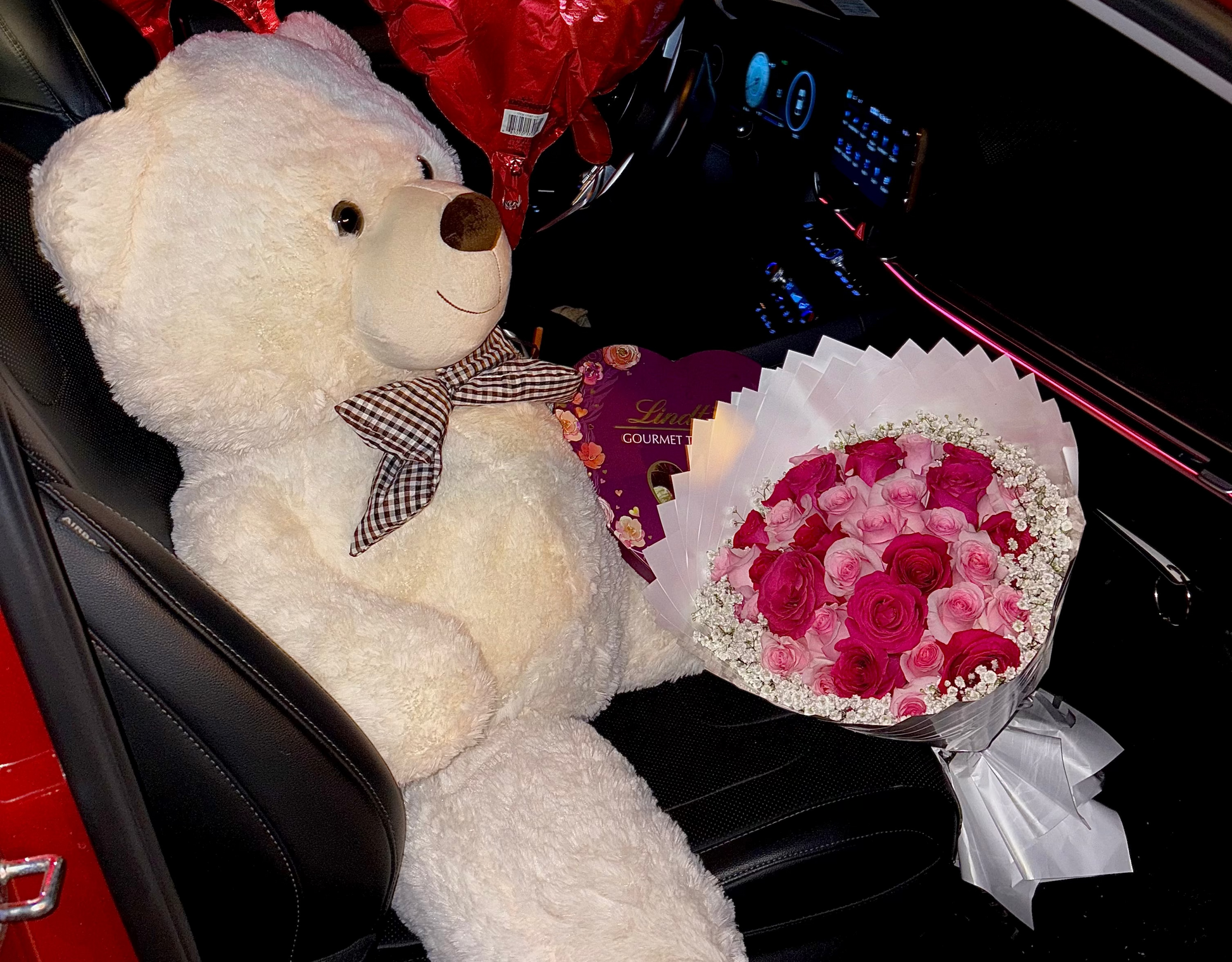A romantic statement wrapped in softness. The Sweetheart Set features a delicate mix of light and dark pink roses surrounded by baby’s breath — paired with a plush teddy bear and a box of Lindt chocolates for the ultimate gesture of affection.