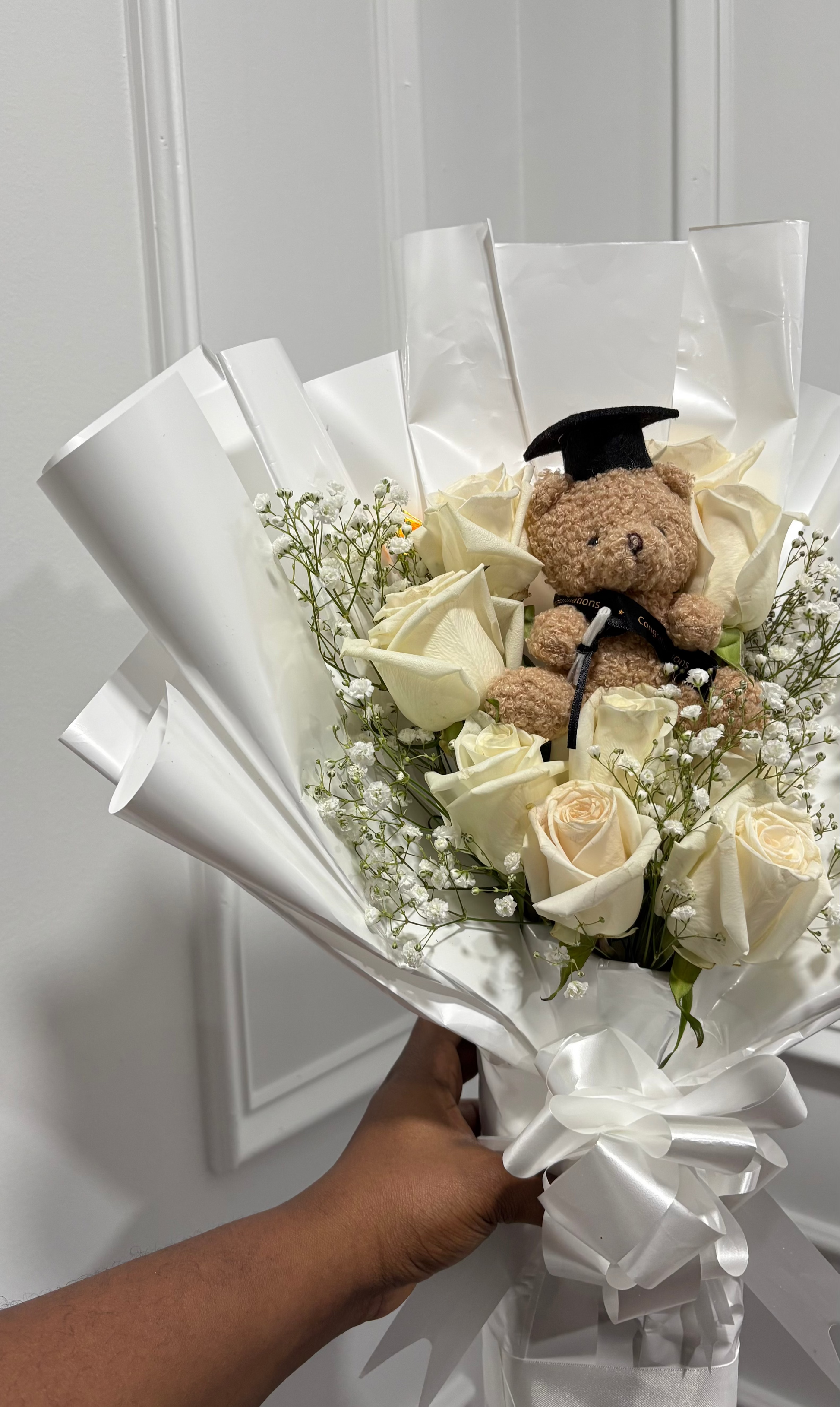 Celebrate every milestone with a little luxury. The Graduate features white roses, soft filler, and a plush bear wearing a cap and gown — a perfect keepsake for new beginnings.